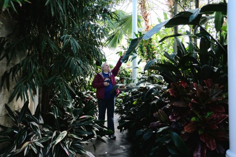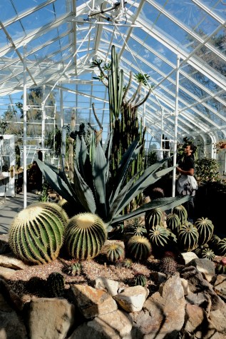 The Conservatory is divided into five themed rooms, each with its own microclimate. Three rooms are fairly warm and humid and house a tightly packed profusion of exotic plants. The airy, light-filled seasonal display room is temperate, and was the perfect place to sit in my shirtsleeves for a spell to enjoy the sun shining through the glass while not being too warm or too chilly. The cactus room at the east end is arid.